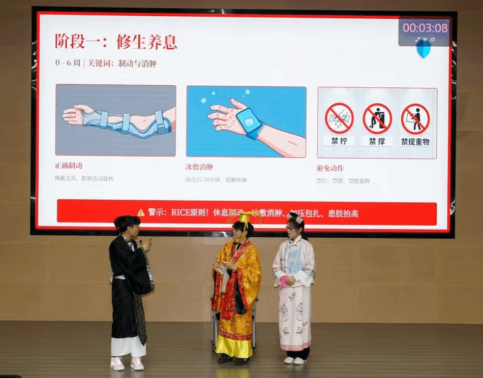我校获奖作品作品《手腕王国风云录》,以古风宫廷为叙事背景,聚焦于三角纤维软骨复合体损伤(TFCC损伤),构建了一个充满趣味的“手腕王国”,通过“皇帝”(患者)、“太医”(康复专家)和“贵妃”(康复榜样)三个角色的情景演绎,形象地展示了TFCC损伤的常见原因、典型症状、专业检查,并系统阐述了康复的四个核心阶段,生动演绎了TFCC损伤的康复全过程。